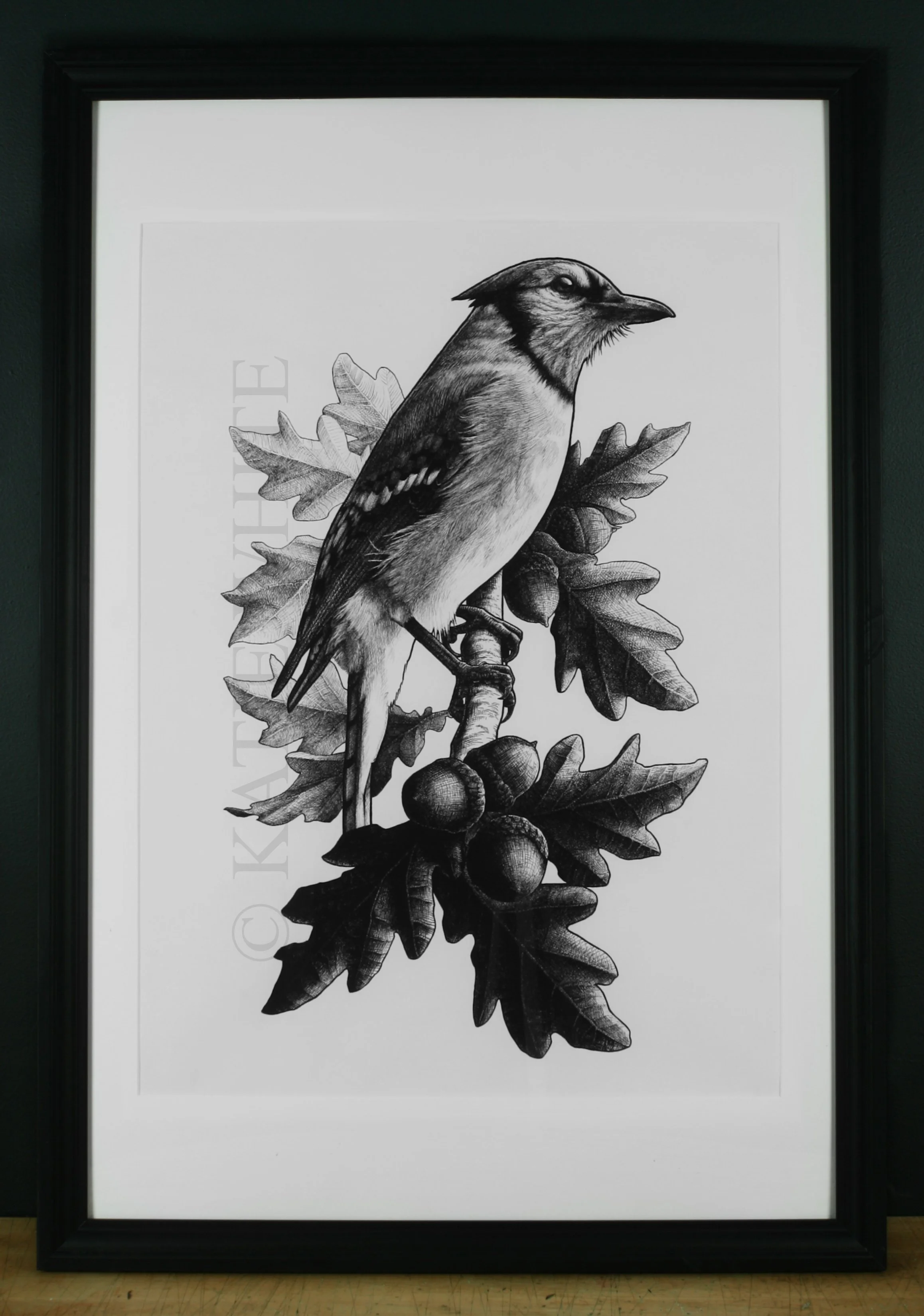 BLUE JAY & OAK LEAVES / PEN & INK / 15” x 21” / 2022